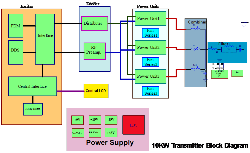 - اکسایتر{شامل بردهای: DDS (مولد سیگنال RF )، PDM (مولد سیگنال عرض پالس) ، رابط اکسایتر (Exciter Interface) و رابط کنترل مرکزی (Central Interface)}
